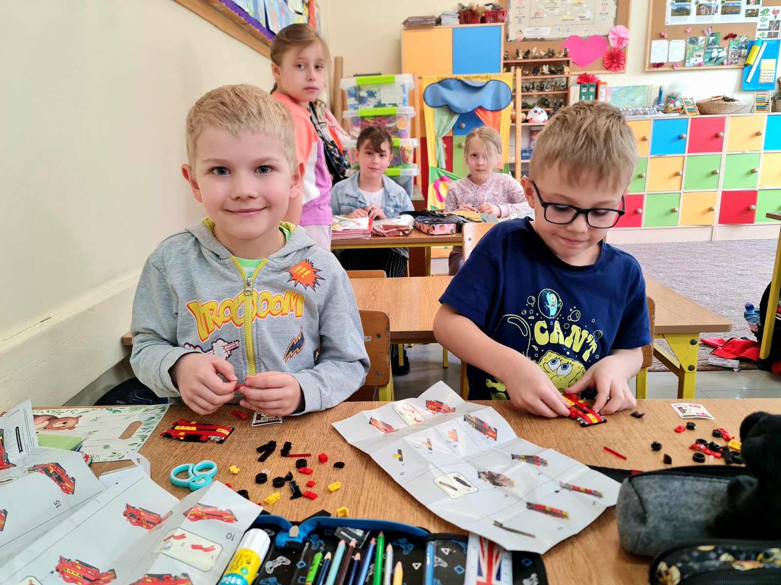 30 maja - z okazji zbliżającego się Dnia Dziecka - uczniowie klasy 1b otrzymali wyjątkowe upominki – kartki z życzeniami, zakładki do książek i klocki LEGO, które od razu stały się główną atrakcją poranka. Podczas lekcji dzieci z zapałem składały swoje zestawy: chłopcy budowali samochody wyścigowe, a dziewczynki – urocze tukany. Każde dziecko mogło poczuć się jak prawdziwy konstruktor, rozwijając przy tym cierpliwość, wyobraźnię i zdolności manualne. W dalszej części dnia uczniowie sięgnęli po dobrze znane im w klasie klocki Korbo. Z ich pomocą jedna grupa stworzyła tor wyścigowy / garaż, a druga – kolorowy ogród dla ptaków. Zabawa zespołowa sprzyjała integracji i wspólnemu podejmowaniu decyzji.