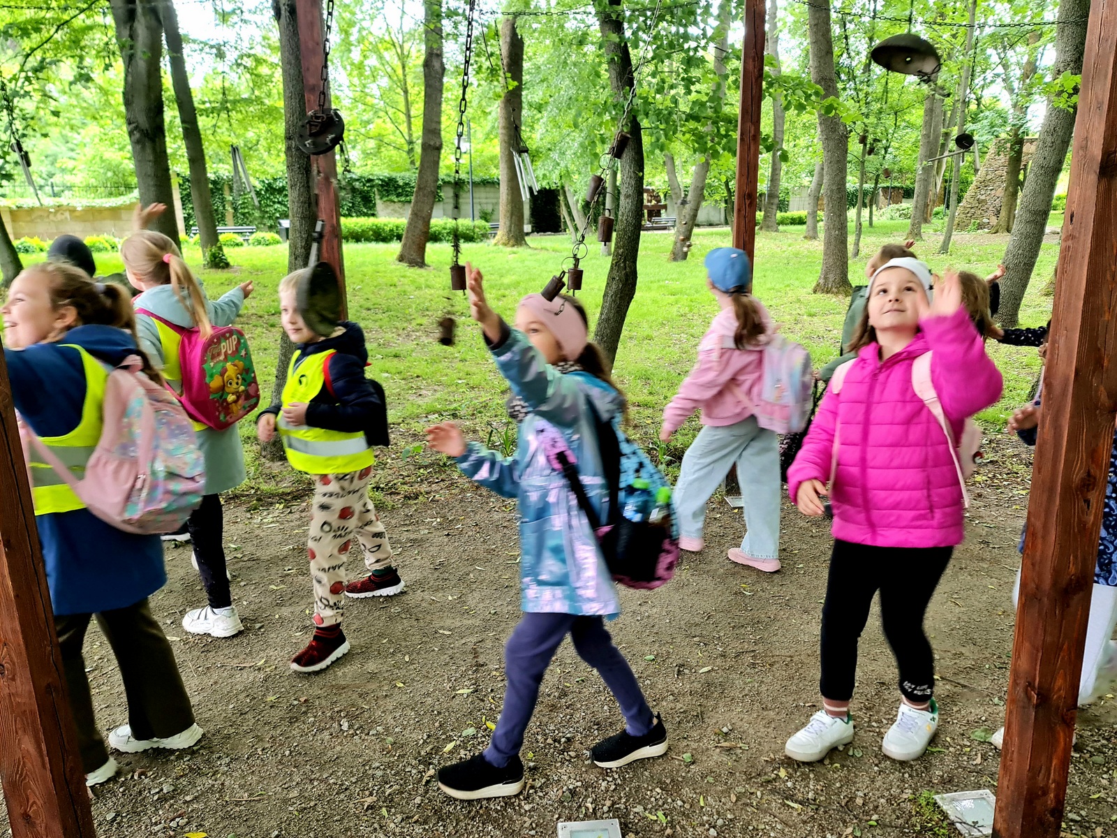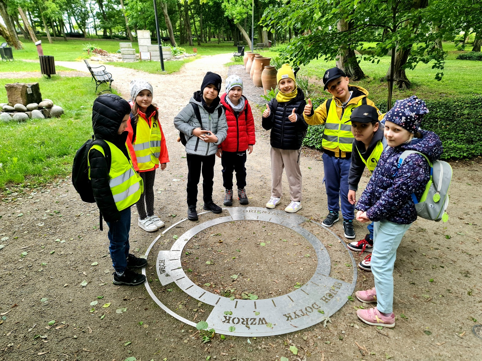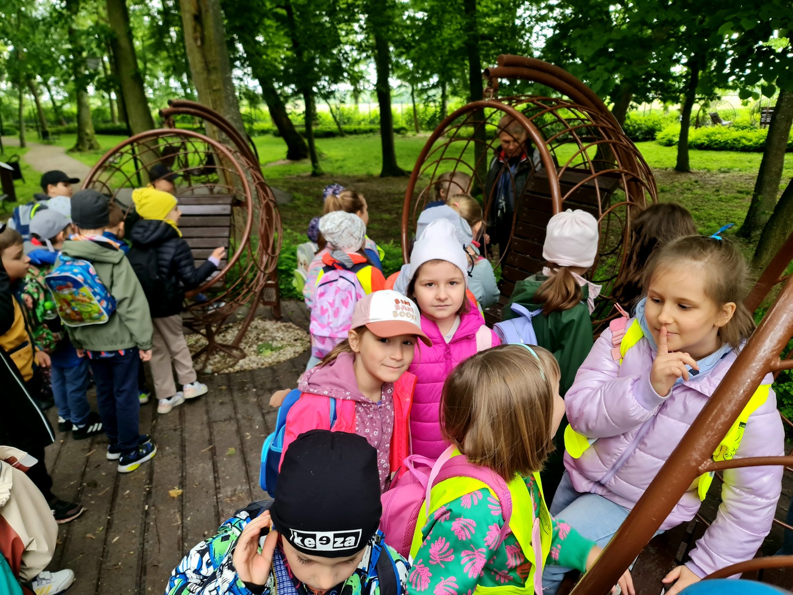 Pierwszym punktem programu były Poddębice, gdzie dzieci odwiedziły zabytkowy Pałac Rodziny Zakrzewskich. Na jego terenie uczniowie poznali postać Marii Konopnickiej – znanej polskiej poetki, której twórczość skierowana do najmłodszych od lat bawi i uczy kolejne pokolenia dzieci. W czasie pobytu pierwszaki z zainteresowaniem słuchały opowieści o jej wierszach i zostały zachęcone do poznawania jej utworów. Następnie uczniowie przespacerowali się po Parku Zmysłów – niezwykłym miejscu, które poprzez zabawę angażuje wszystkie zmysły i rozwija dziecięcą ciekawość świata. Jedną z tamtejszych atrakcji była także degustacja wody w Pijalni Wód Termalnych. Podczas zwiedzania duże zainteresowanie wzbudziła również obecność artystów – rzeźbiarzy w drewnie, którzy właśnie pracowali przy tworzeniu swoich dzieł. Uczniowie z ciekawością obserwowali ich powstawanie i zadawali pytania twórcom.