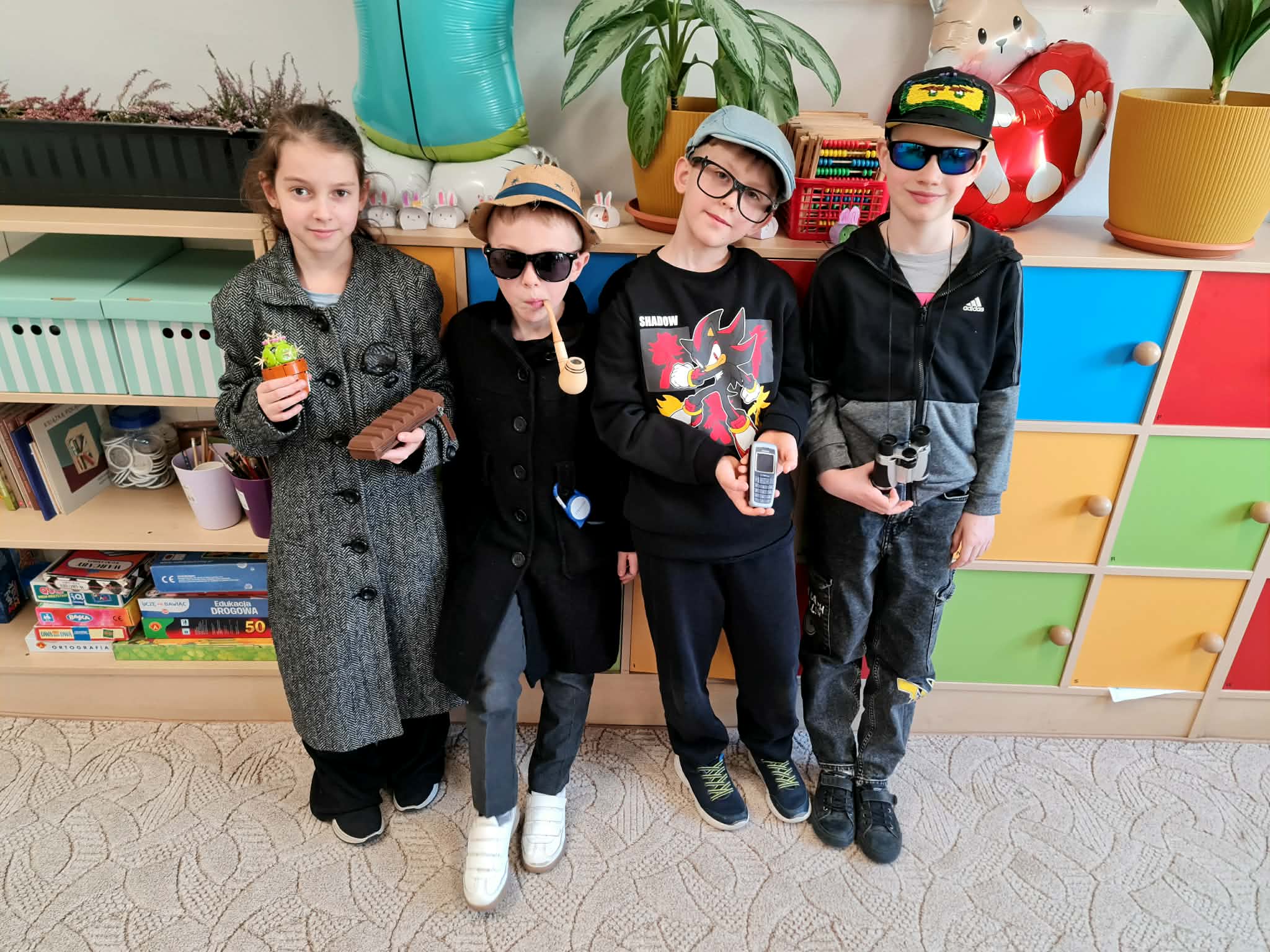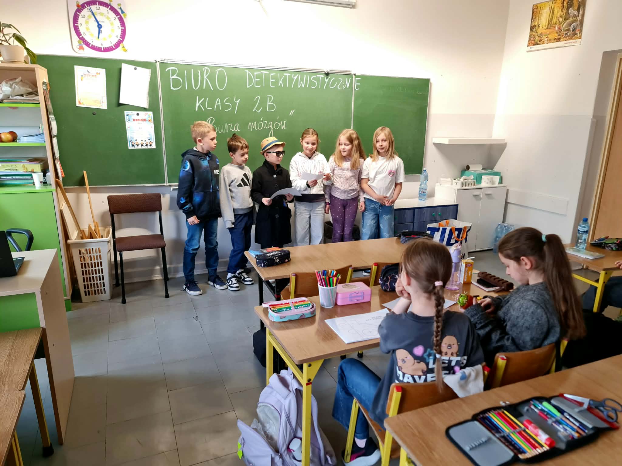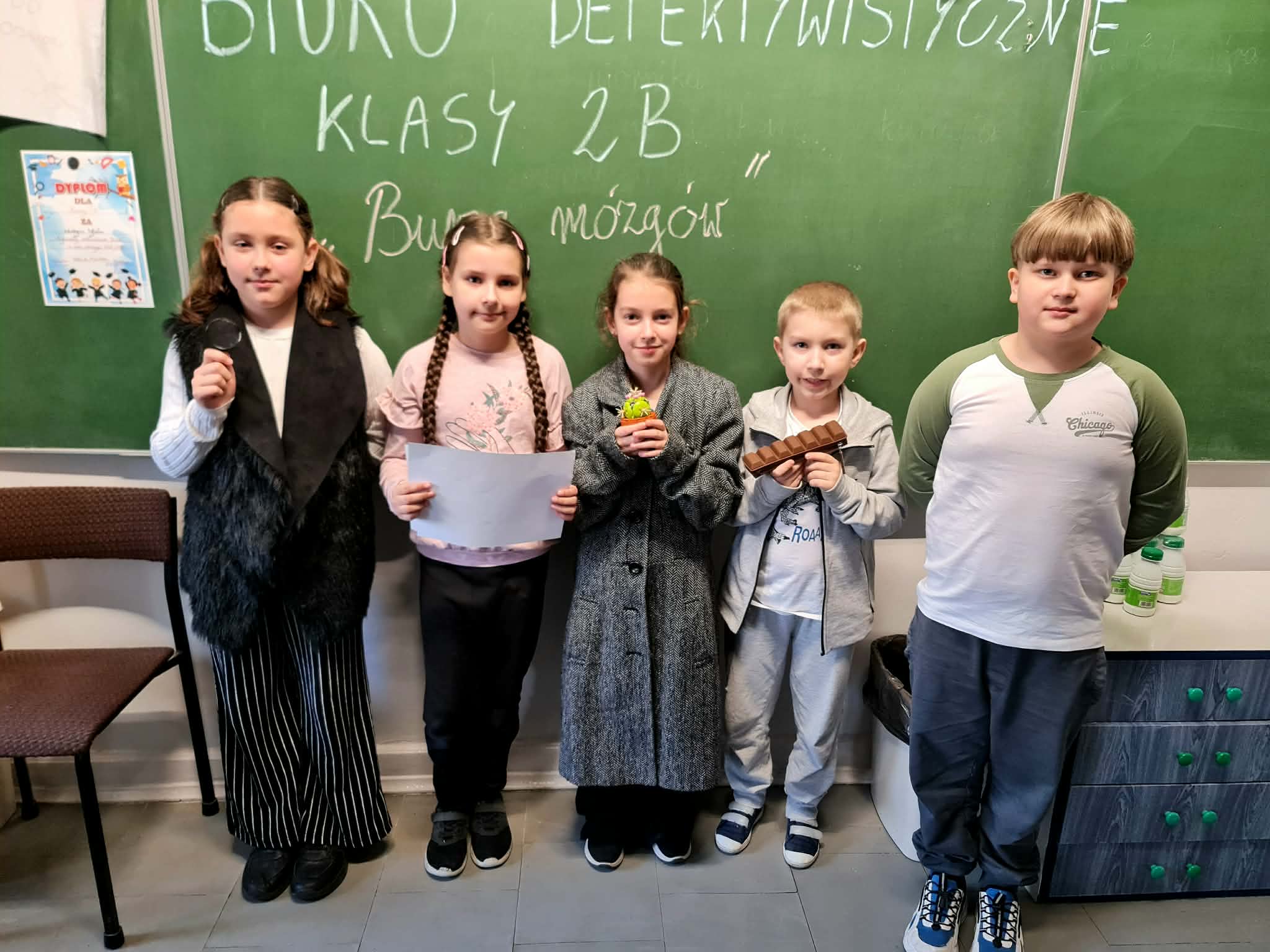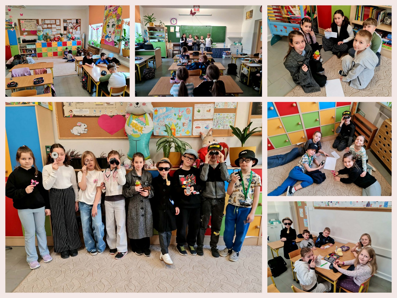 Pod koniec marca, w nawiązaniu do omawianej lektury pt.: „Detektyw Pozytywka”, uczniowie klasy 2b wzięli udział w nietypowych zajęciach. Na początku cała klasa założyła swoją agencję detektywistyczną i wymyśliła dla niej nazwę. Niektórzy chętni uczniowie tak bardzo wczuli się w rolę detektywów, że z okazji tych planowanych tematycznych zajęć przyszli do szkoły w specjalnych przebraniach i przynieśli ze sobą różne detektywistyczne akcesoria. Następnie uczniowie zostali podzieleni na cztery zespoły, których zadaniem było rozwikłanie zagadkowych historii otrzymanych od tajemniczych klientów. Każda grupa z dużym zaangażowaniem analizowała wskazówki i szukała właściwych rozwiązań. Na zakończenie zespoły zaprezentowały swoje pomysły na rozwiązanie powierzonych im spraw. Dzieci świetnie poradziły sobie z zadaniami, wykazując się spostrzegawczością, logicznym myśleniem, kreatywnością oraz umiejętnością współpracy.