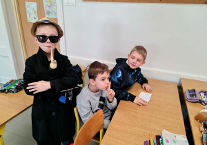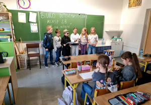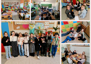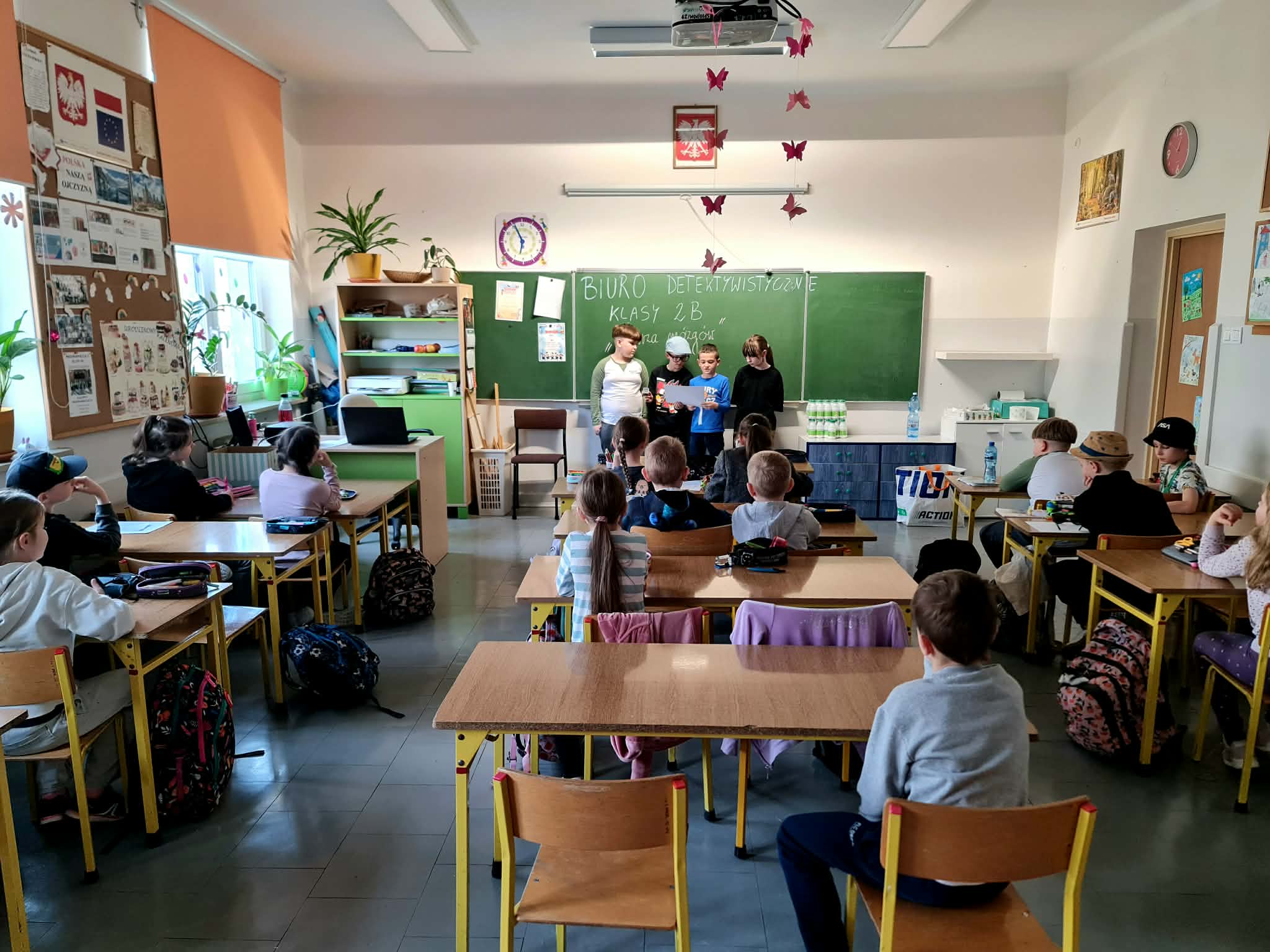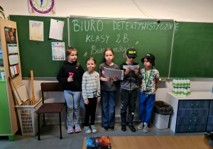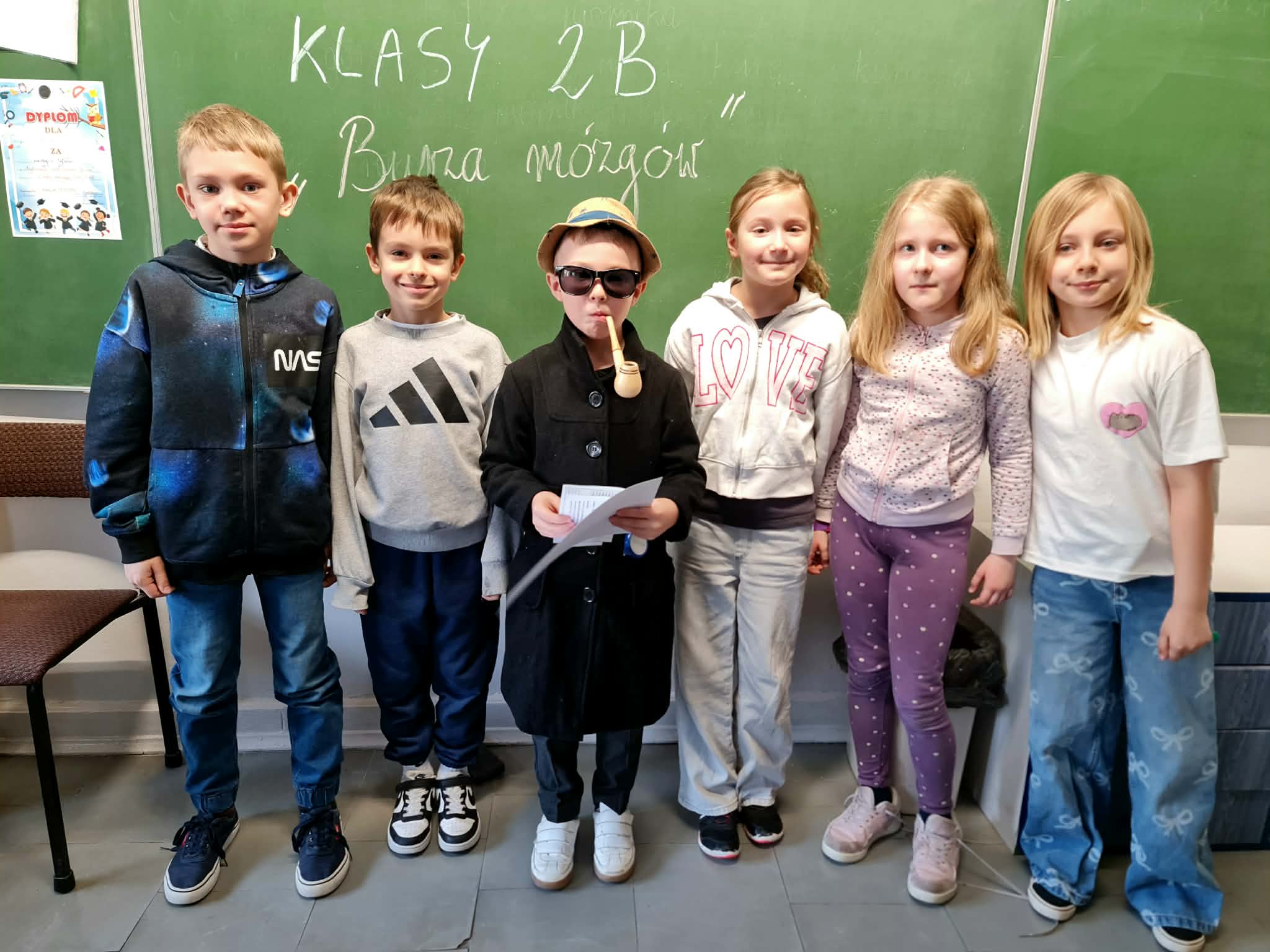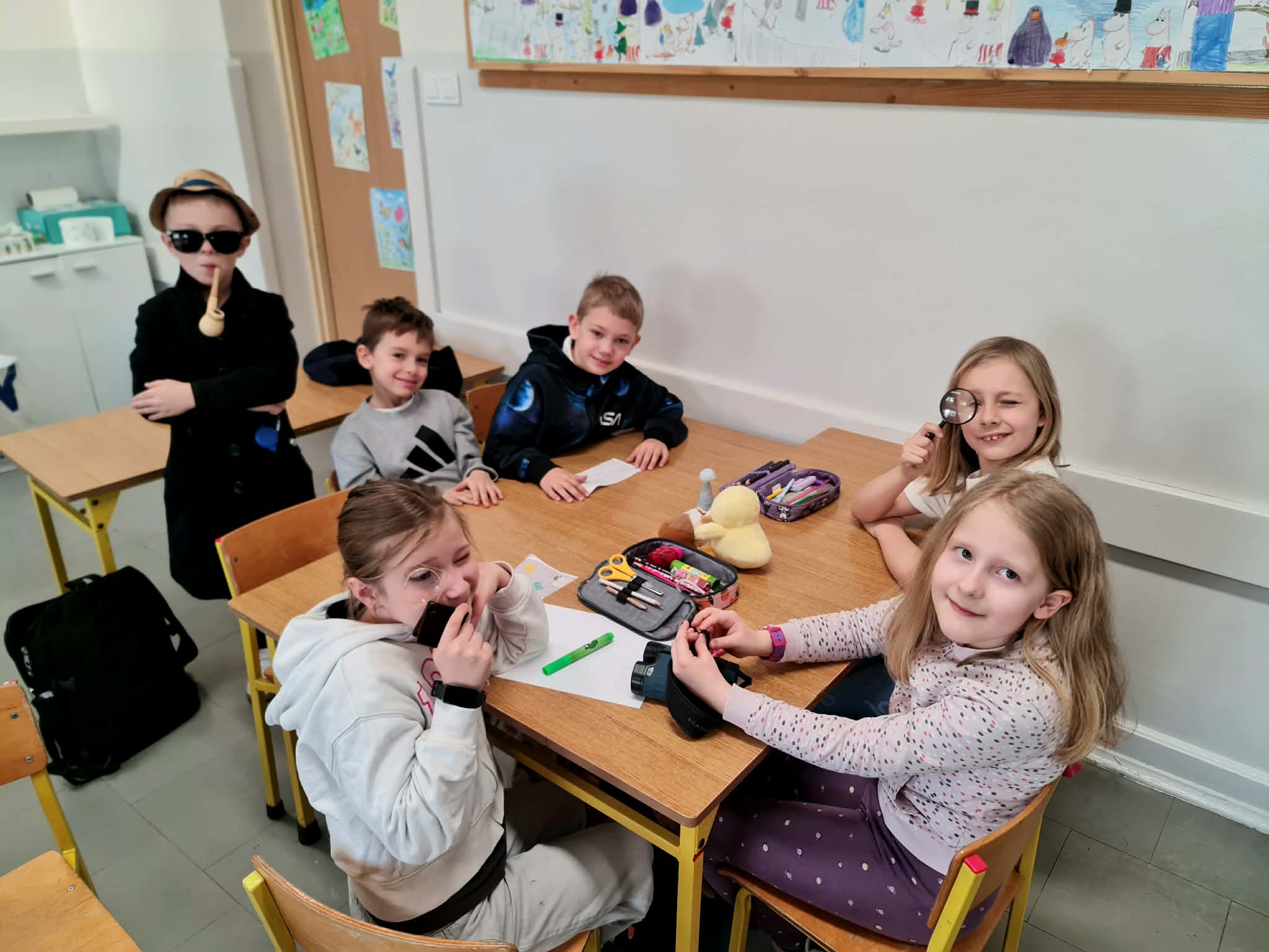 Pod koniec marca, w nawiązaniu do omawianej lektury pt.: „Detektyw Pozytywka”, uczniowie klasy 2b wzięli udział w nietypowych zajęciach. Na początku cała klasa założyła swoją agencję detektywistyczną i wymyśliła dla niej nazwę. Niektórzy chętni uczniowie tak bardzo wczuli się w rolę detektywów, że z okazji tych planowanych tematycznych zajęć przyszli do szkoły w specjalnych przebraniach i przynieśli ze sobą różne detektywistyczne akcesoria. Następnie uczniowie zostali podzieleni na cztery zespoły, których zadaniem było rozwikłanie zagadkowych historii otrzymanych od tajemniczych klientów. Każda grupa z dużym zaangażowaniem analizowała wskazówki i szukała właściwych rozwiązań. Na zakończenie zespoły zaprezentowały swoje pomysły na rozwiązanie powierzonych im spraw. Dzieci świetnie poradziły sobie z zadaniami, wykazując się spostrzegawczością, logicznym myśleniem, kreatywnością oraz umiejętnością współpracy.