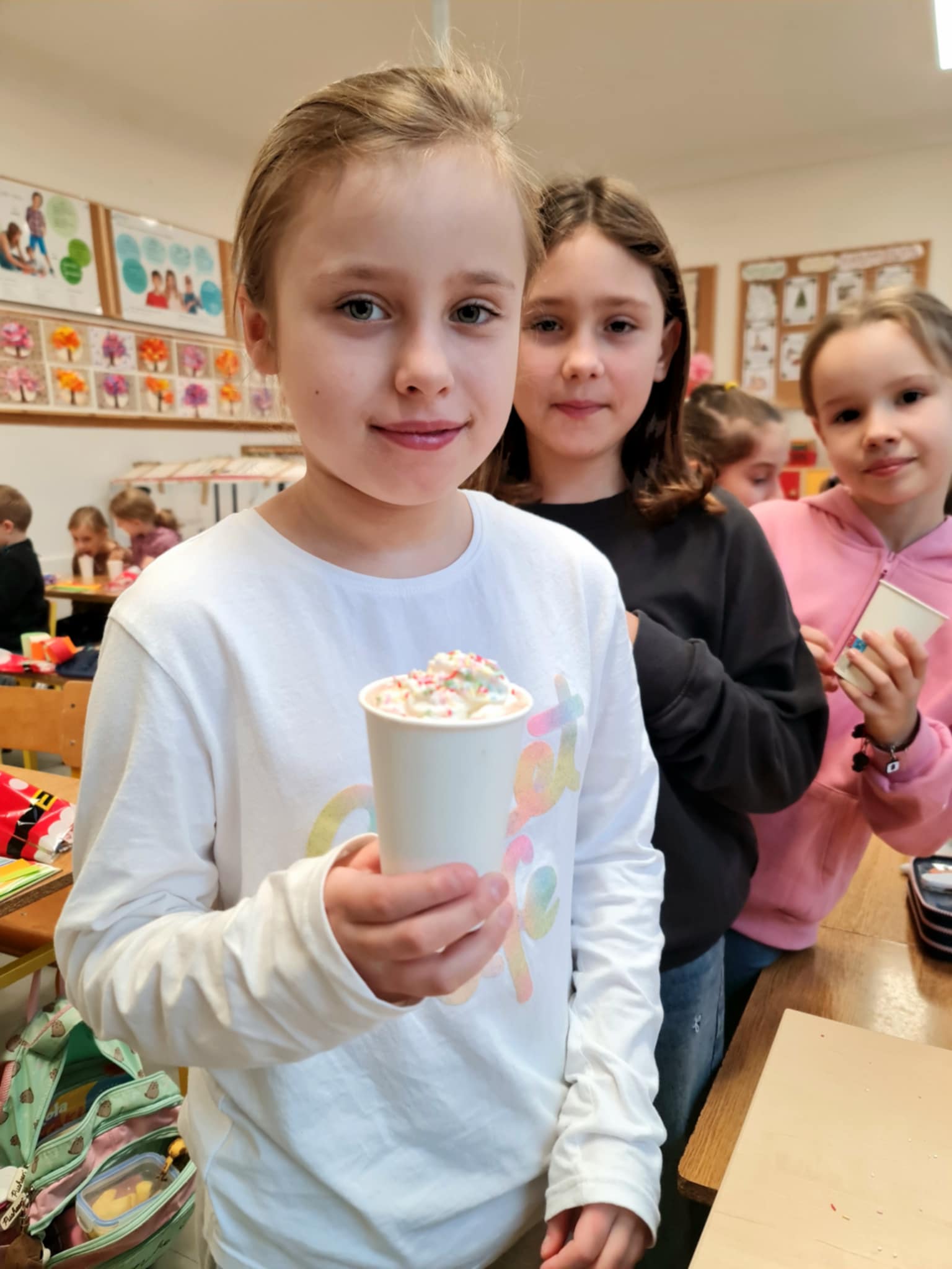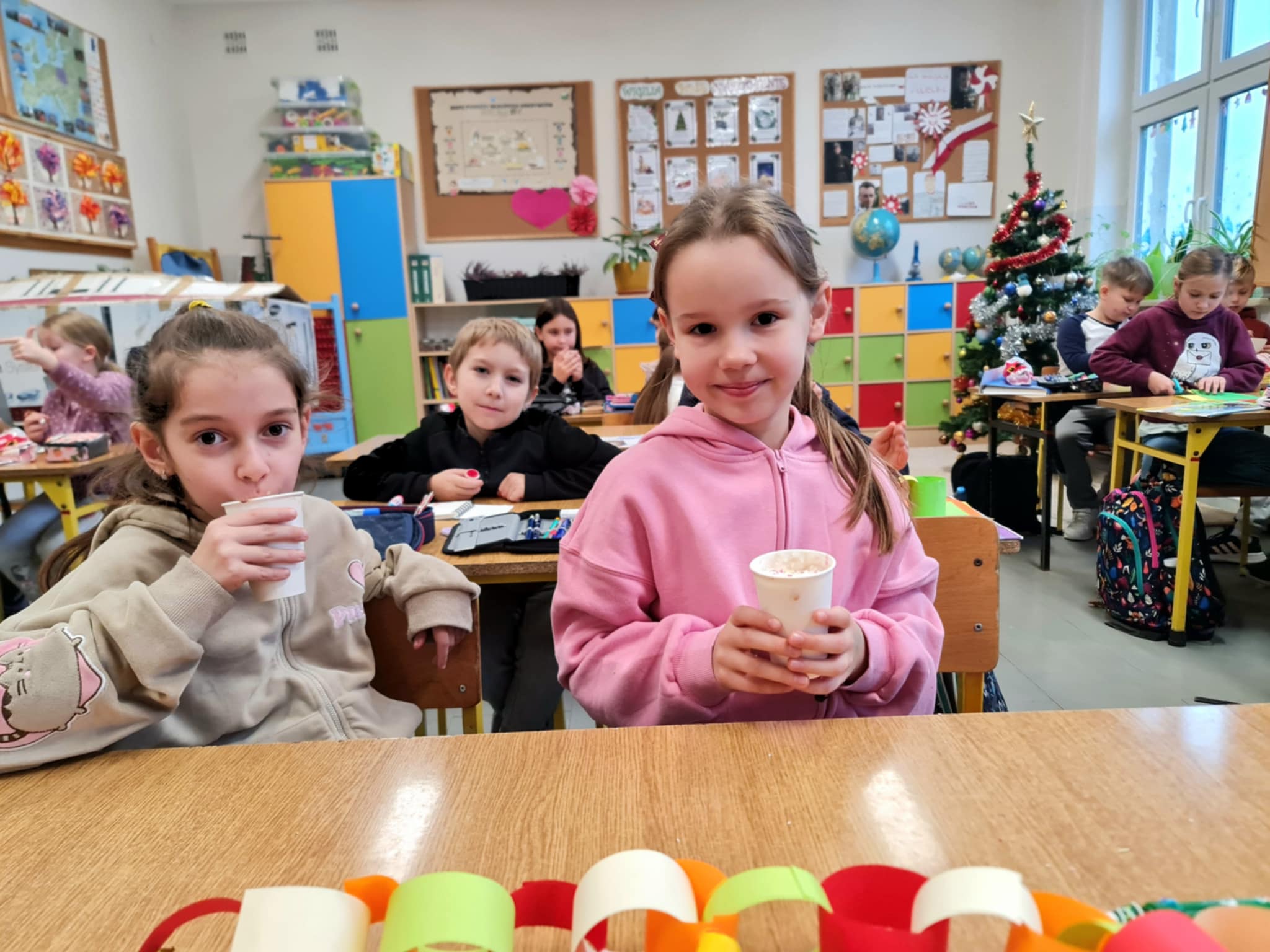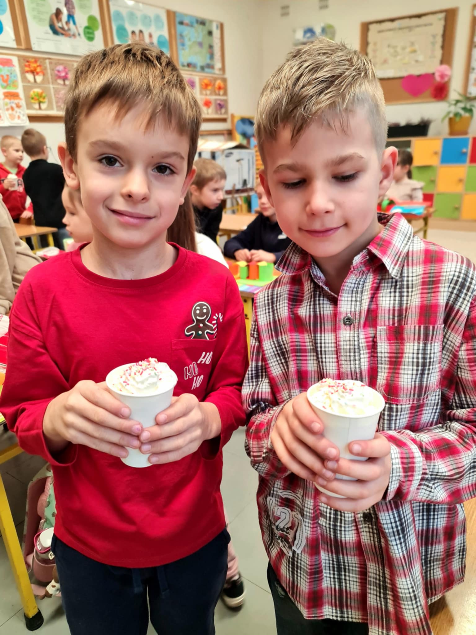 Później uczniowie wspólnie obejrzeli bajkę pt.:„Ekspres polarny”. W pewnym momencie wydarzyło się coś naprawdę wyjątkowego – kiedy dzieci w filmie częstowano gorącą czekoladą podczas podróży na Biegun Północny - w naszej klasie również pojawiła się słodka, pachnąca, gorąca czekolada, przygotowana specjalnie dla klasy 2b. Ten magiczny moment sprawił, że granica między filmem, a rzeczywistością na chwilę zupełnie zniknęła.
