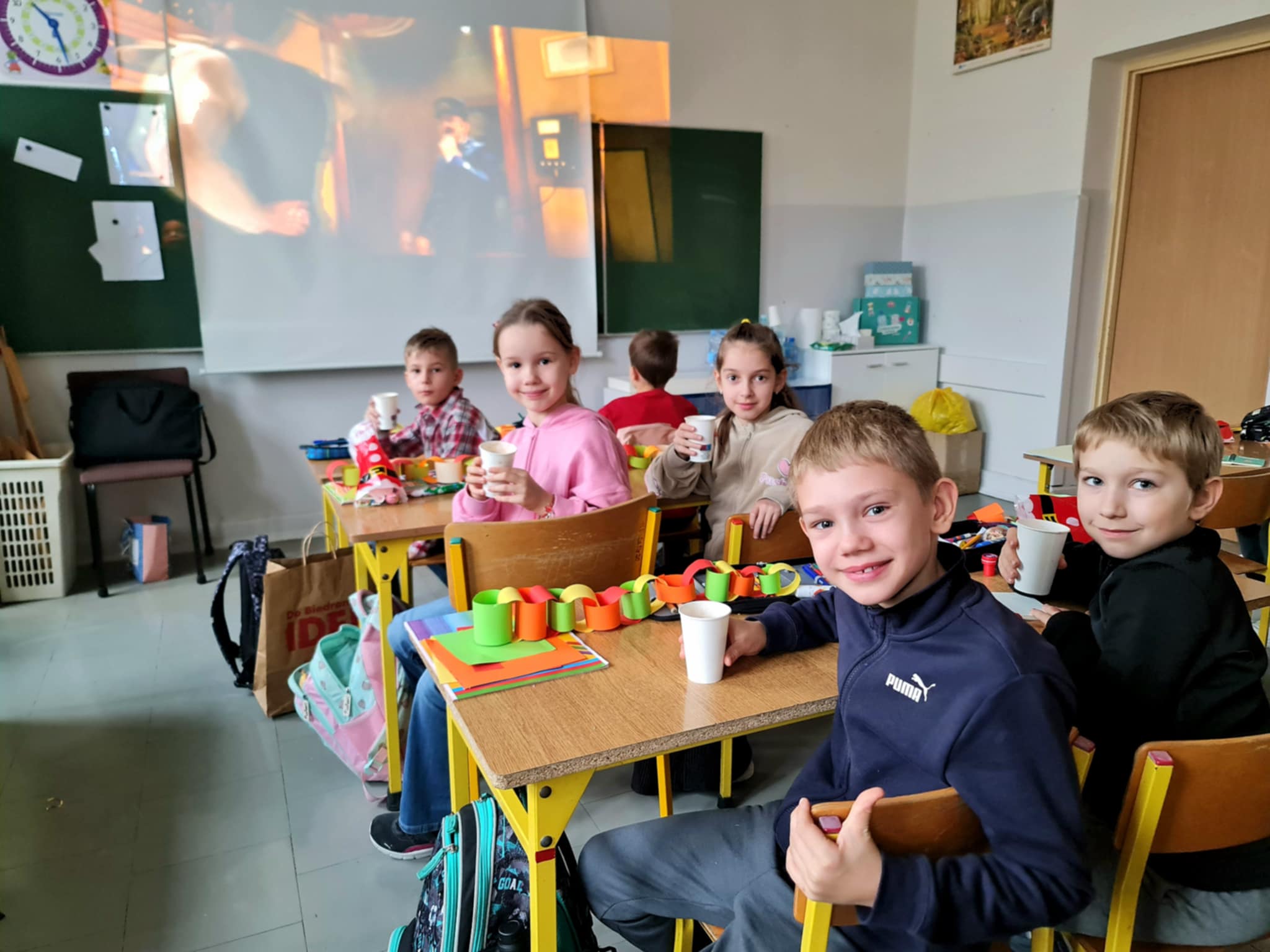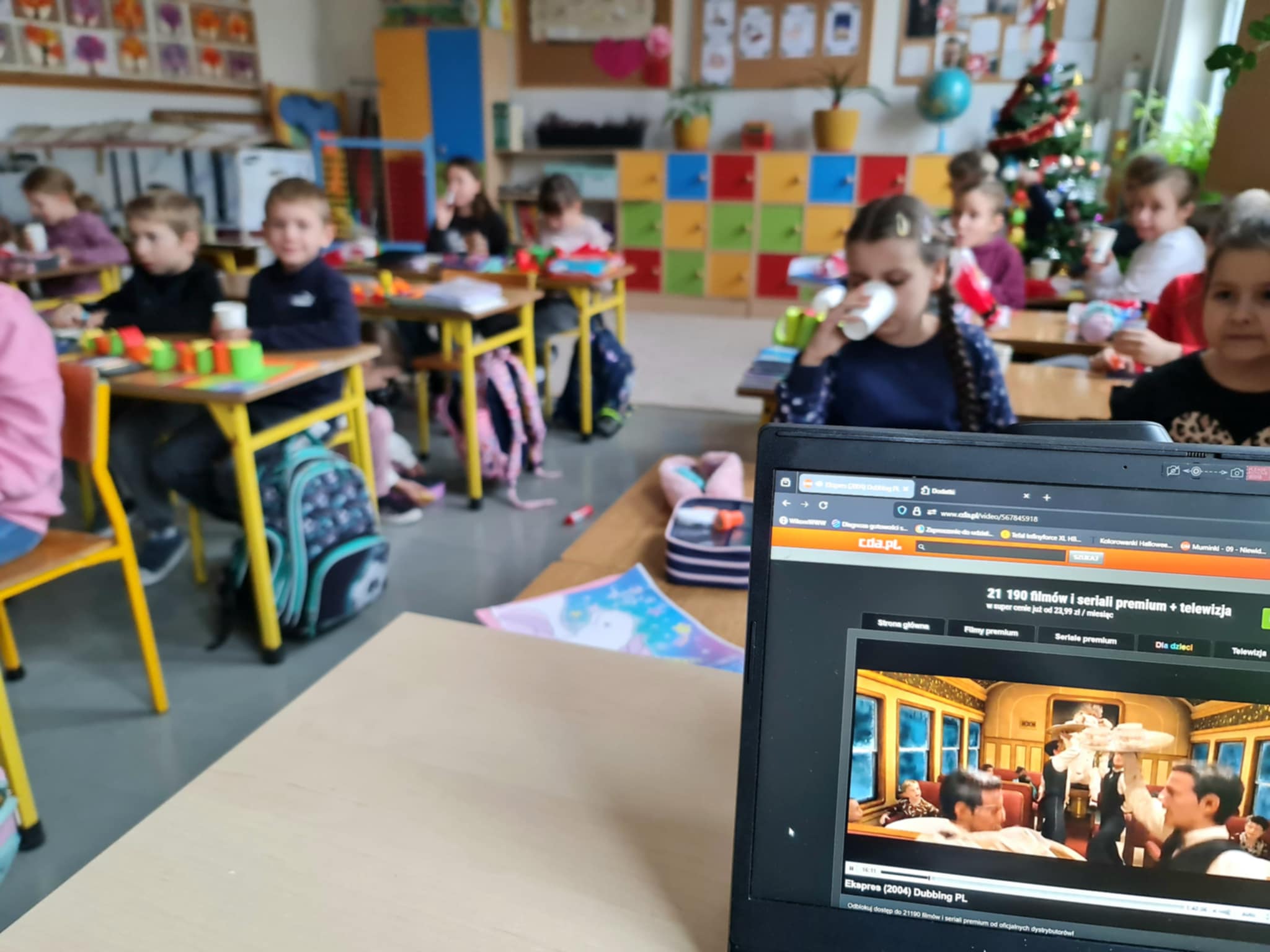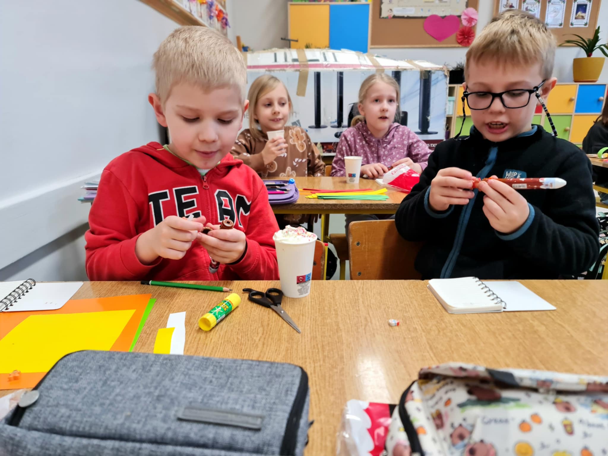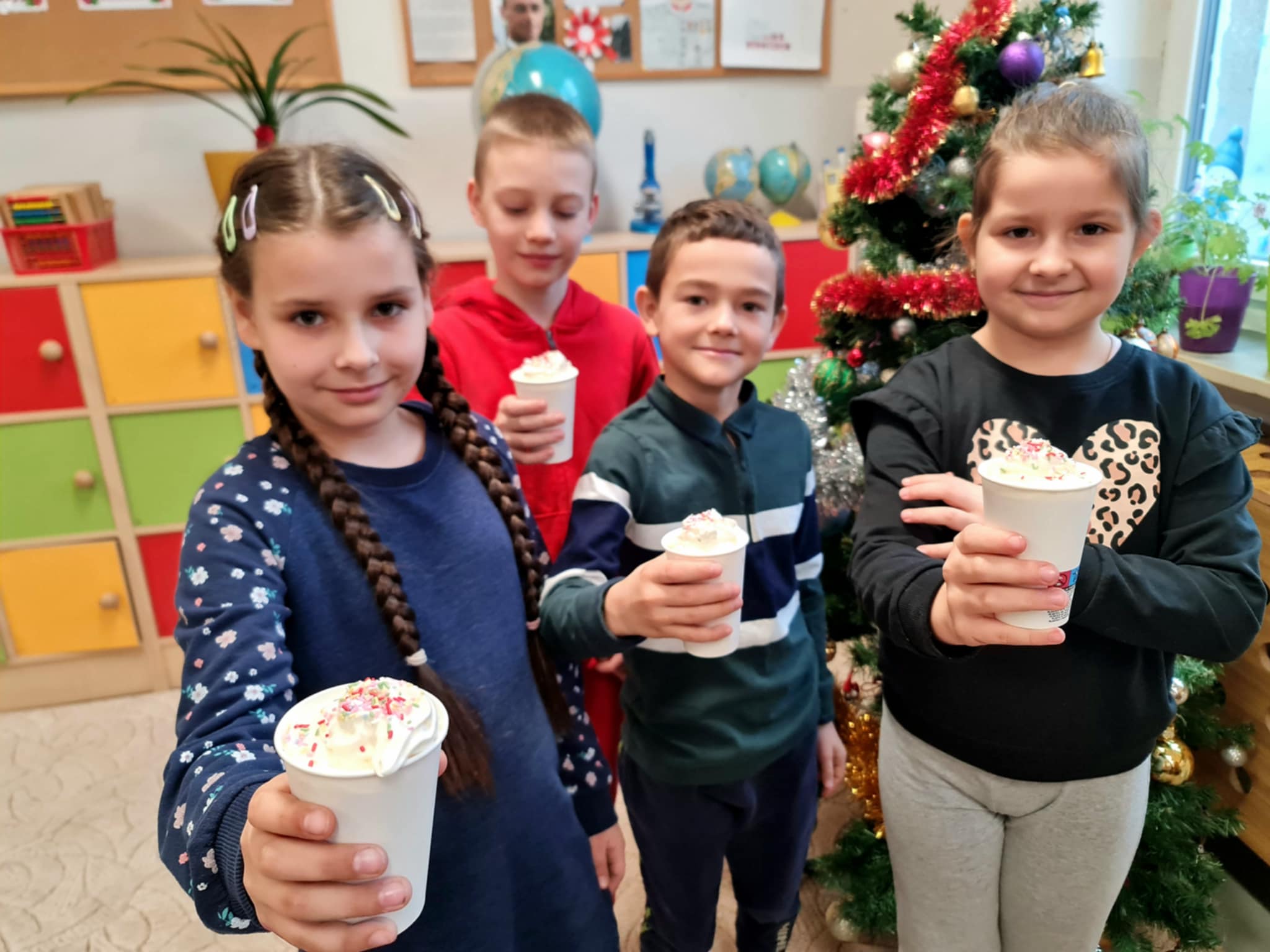 Później uczniowie wspólnie obejrzeli bajkę pt.:„Ekspres polarny”. W pewnym momencie wydarzyło się coś naprawdę wyjątkowego – kiedy dzieci w filmie częstowano gorącą czekoladą podczas podróży na Biegun Północny - w naszej klasie również pojawiła się słodka, pachnąca, gorąca czekolada, przygotowana specjalnie dla klasy 2b. Ten magiczny moment sprawił, że granica między filmem, a rzeczywistością na chwilę zupełnie zniknęła.