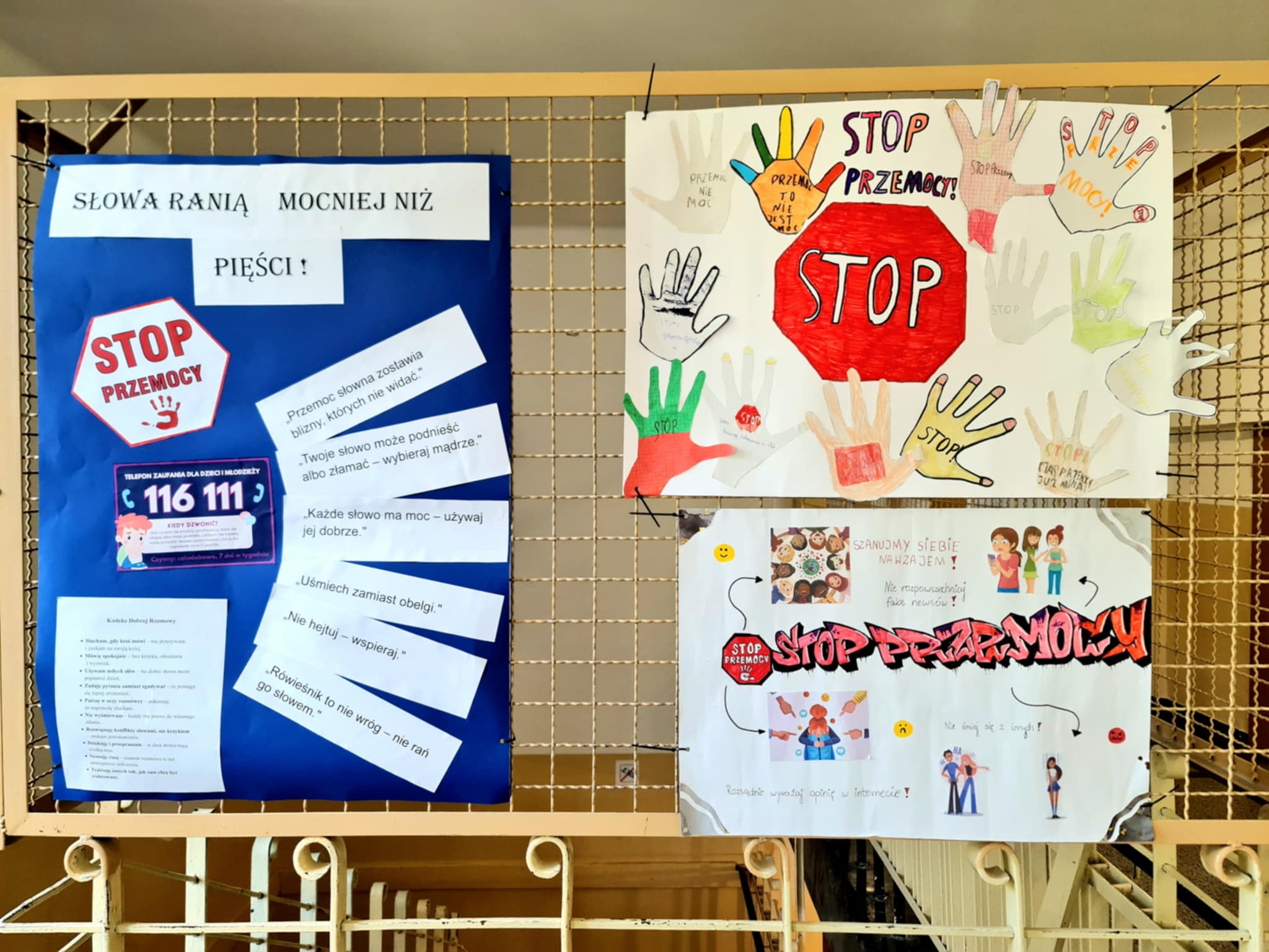 Starsze klasy (IV–VIII) uczestniczyły w tematycznych lekcjach wychowawczych i spotkaniach z pedagogiem szkolnym p. Anną Wardęcką. Rozmawiały o przemocy fizycznej, psychicznej i cyberprzemocy oraz o tym, jak budować atmosferę życzliwości i wsparcia. Uczniowie przygotowali plakaty przedstawiające sposoby przeciwdziałania przemocy i promujące przyjaźń.
