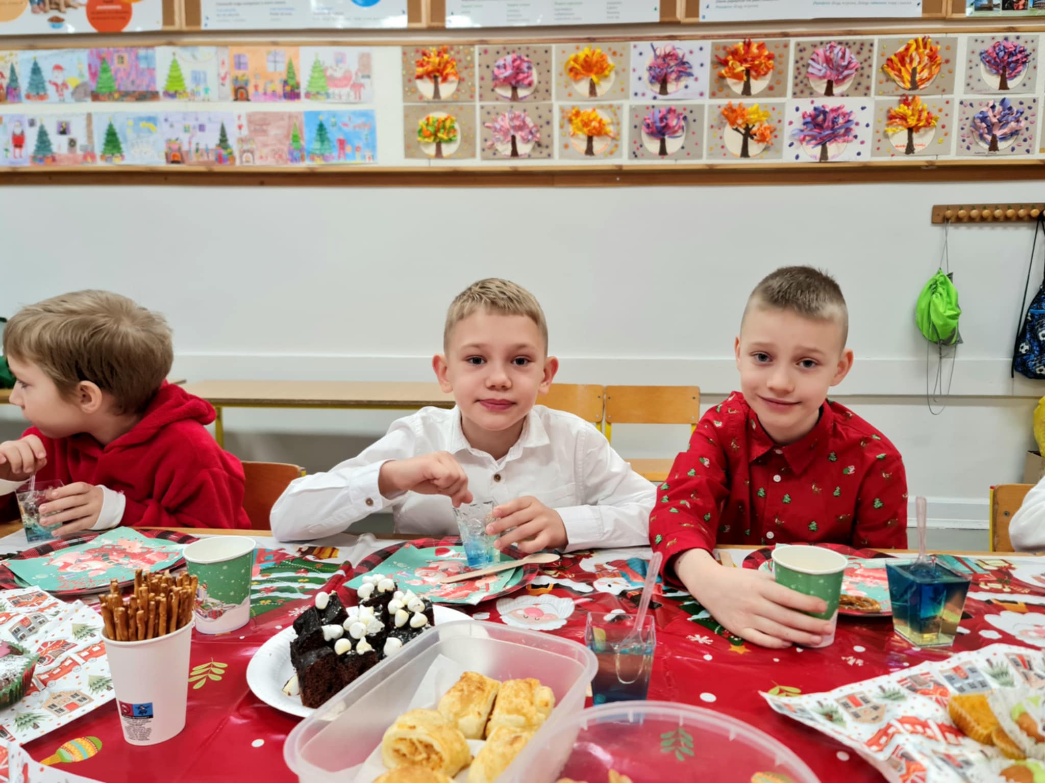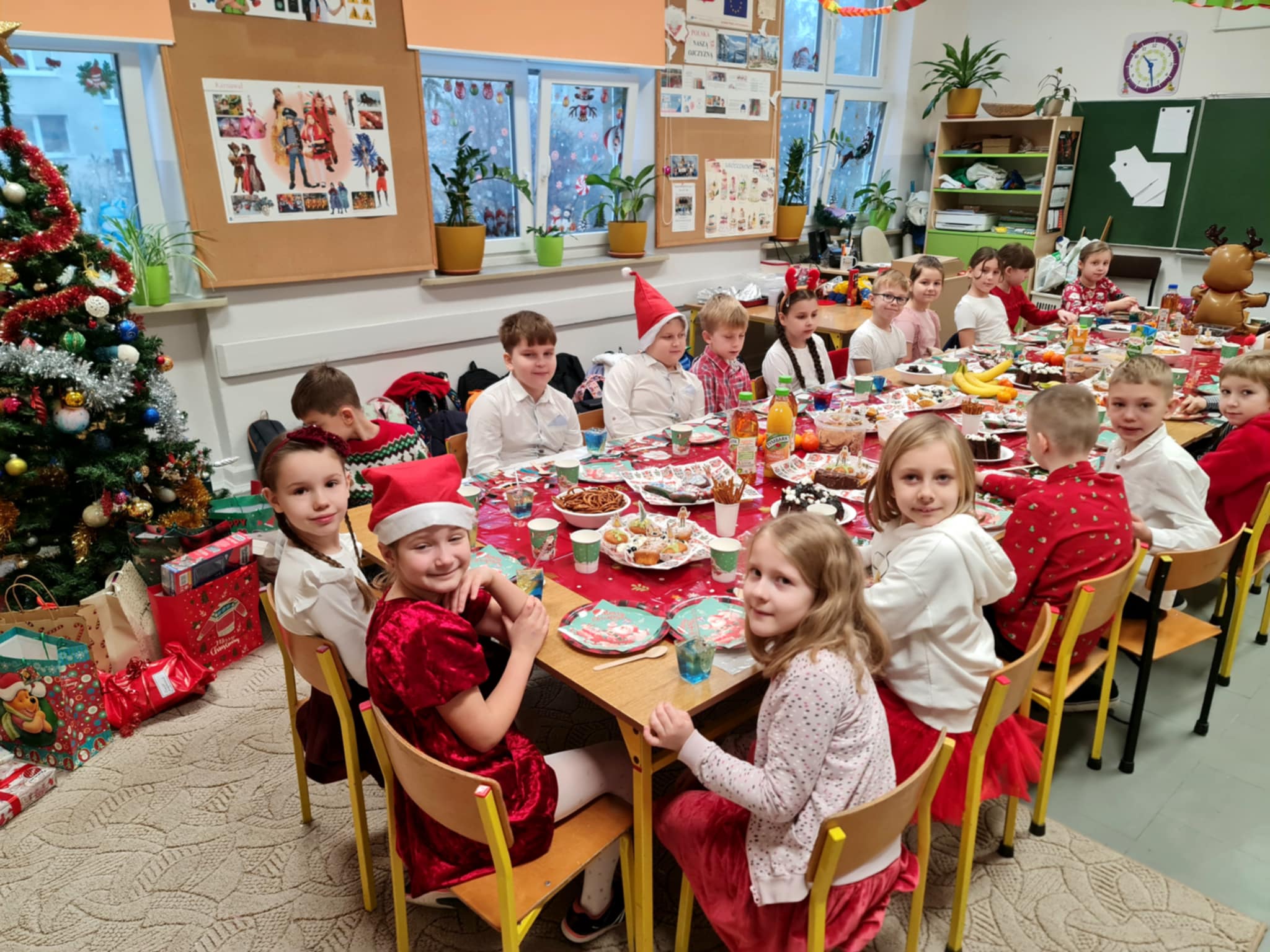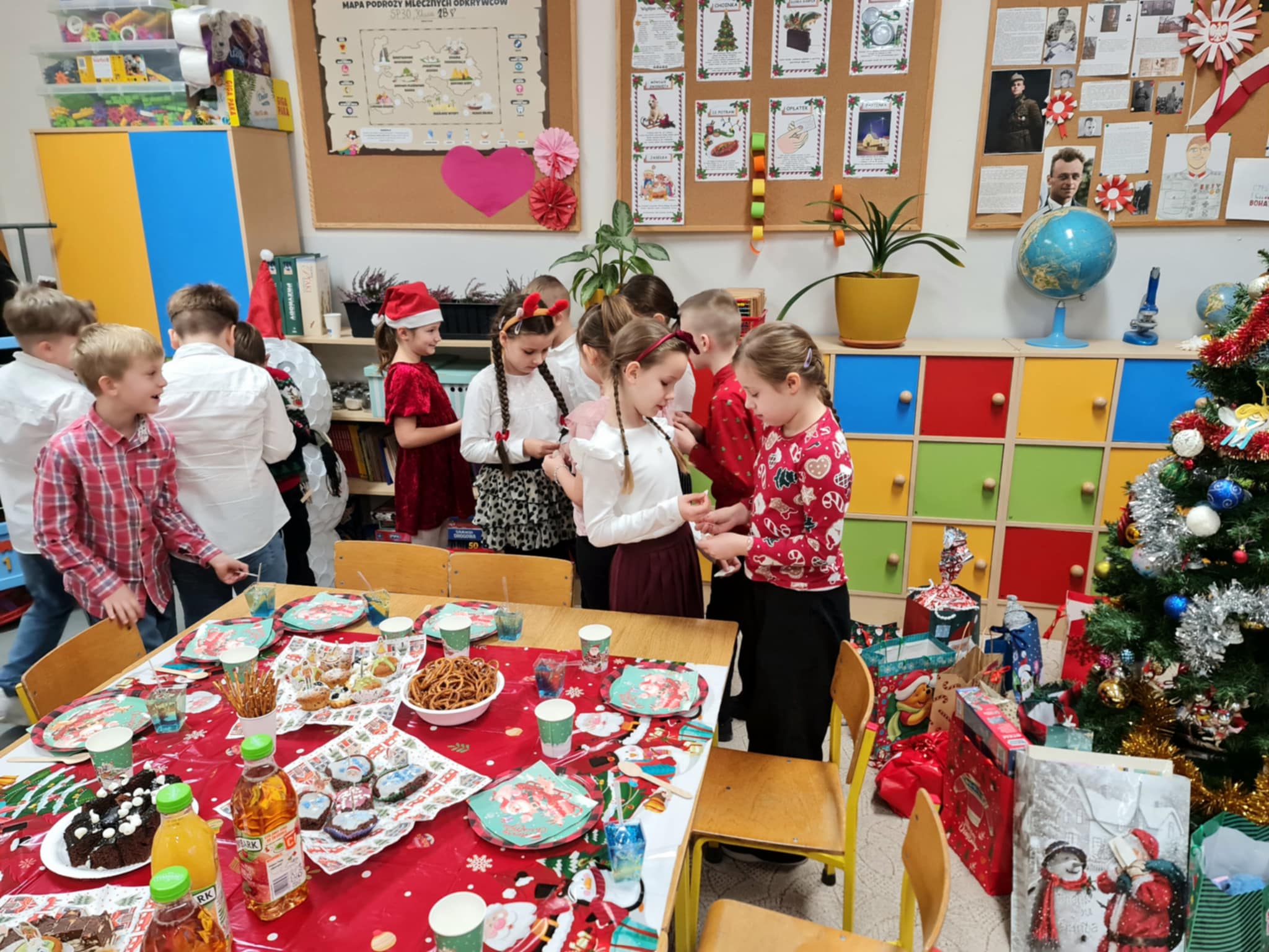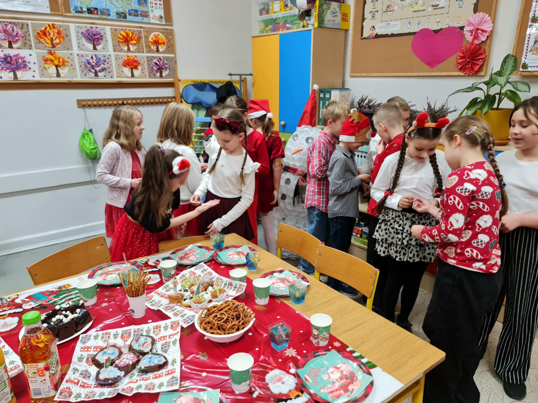 Następnie uczniowie zasiedli przy pięknie udekorowanym stole(podziękowania dla p. Adrianny Dudzik i p. Aleksandry Pecyny), na którym nie zabrakło świątecznych słodkości. Wspólne biesiadowanie było doskonałą okazją do rozmów i integracji.