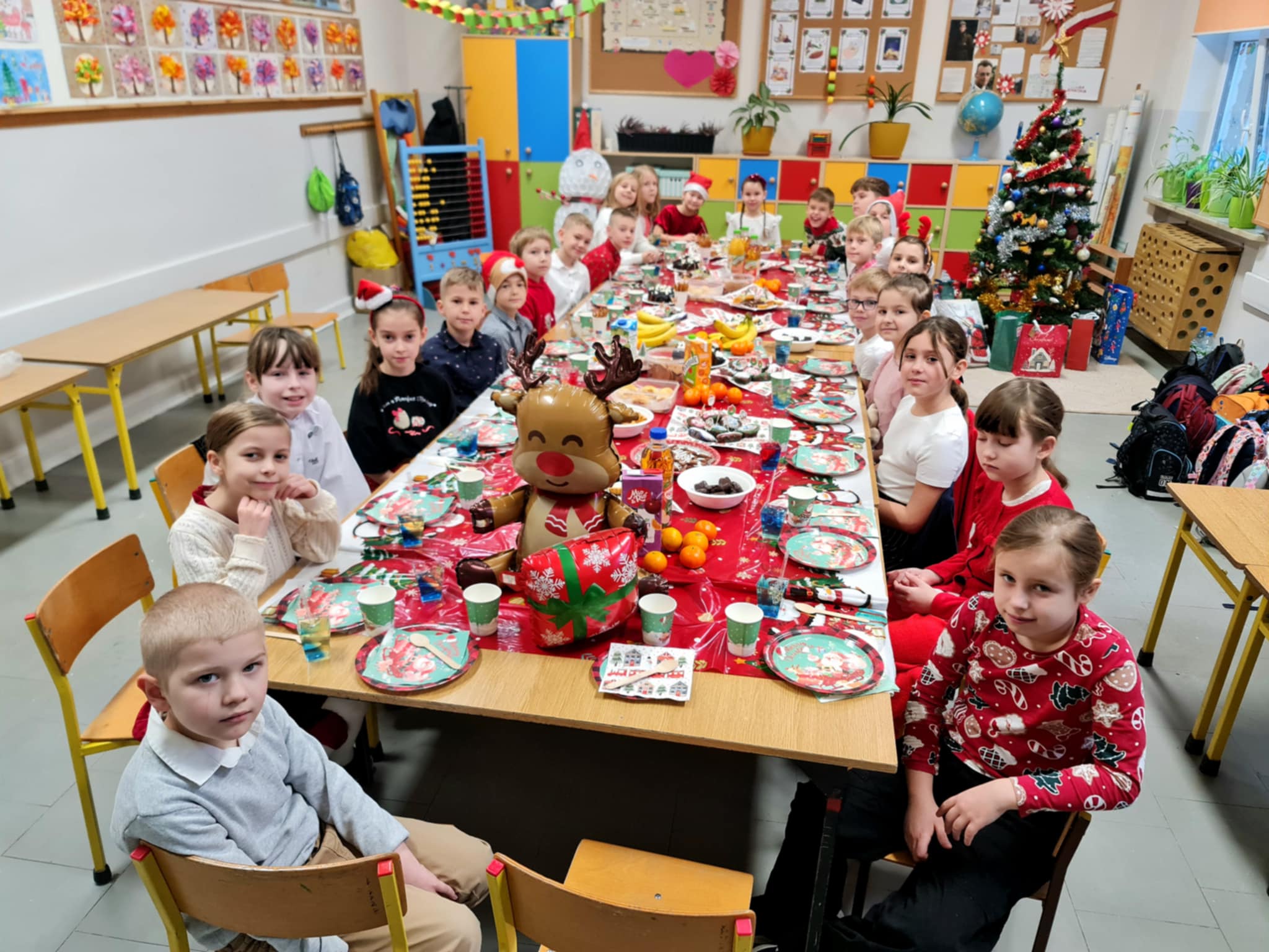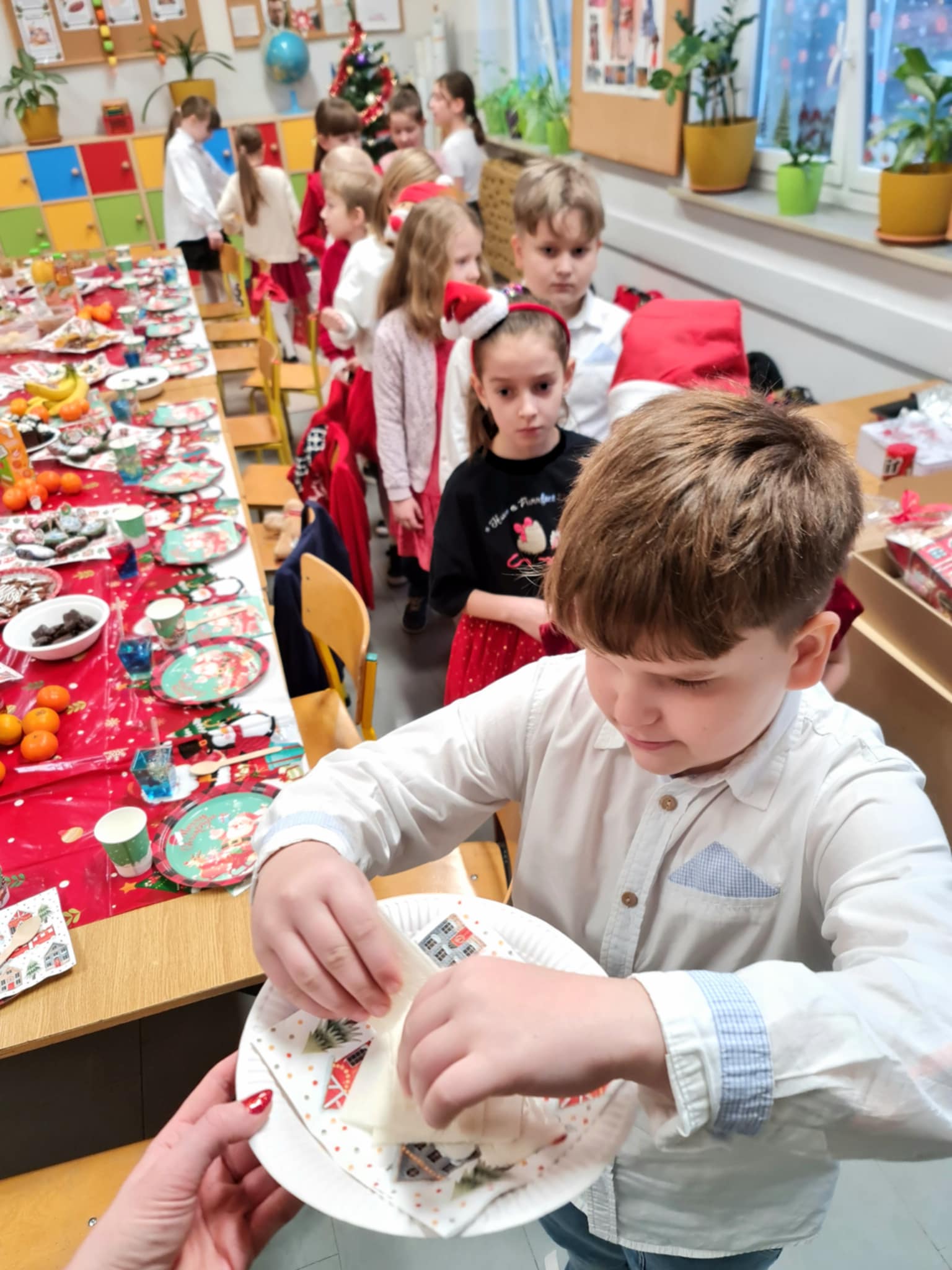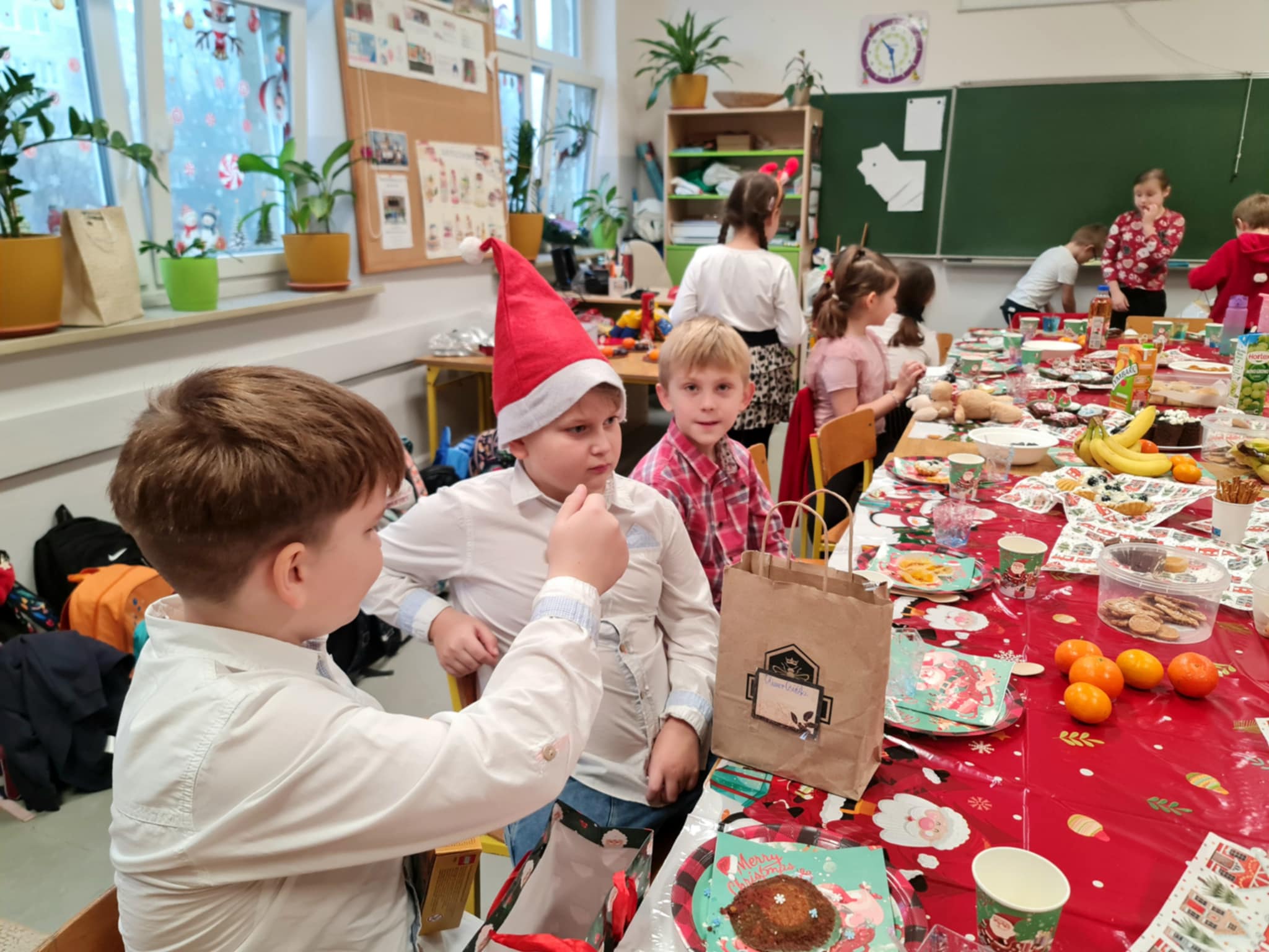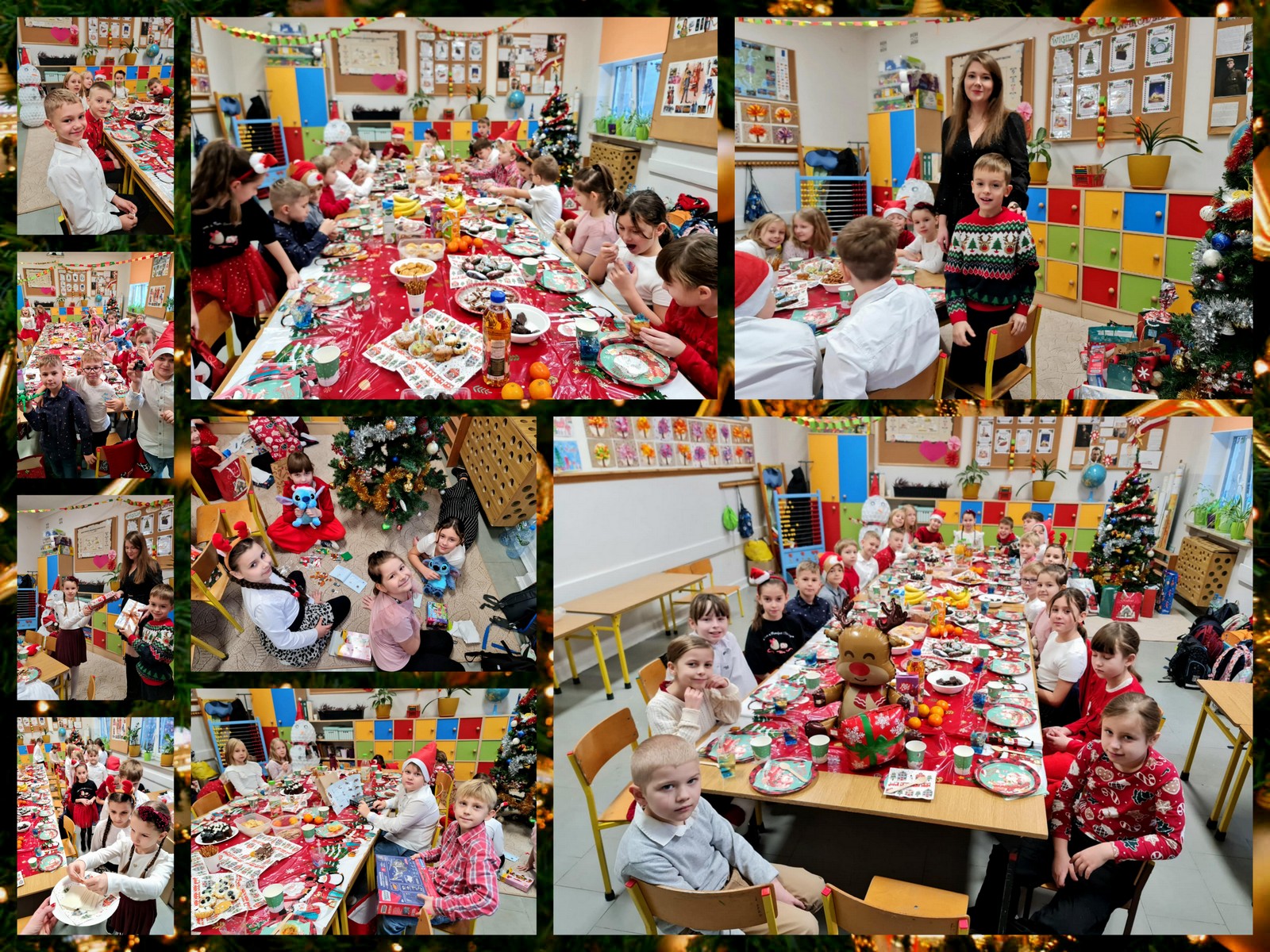 Następnie uczniowie zasiedli przy pięknie udekorowanym stole(podziękowania dla p. Adrianny Dudzik i p. Aleksandry Pecyny), na którym nie zabrakło świątecznych słodkości. Wspólne biesiadowanie było doskonałą okazją do rozmów i integracji.