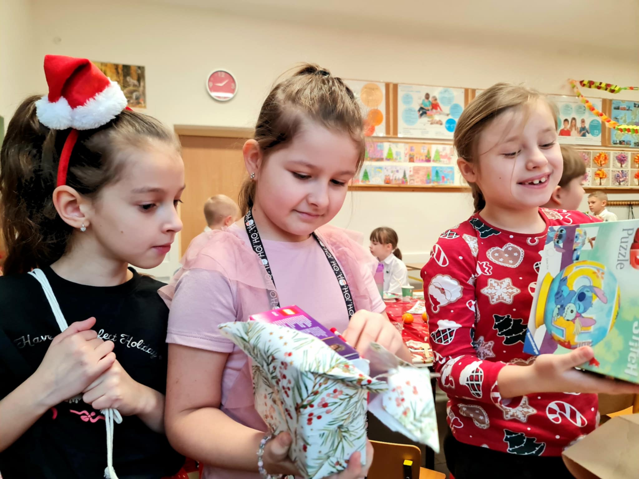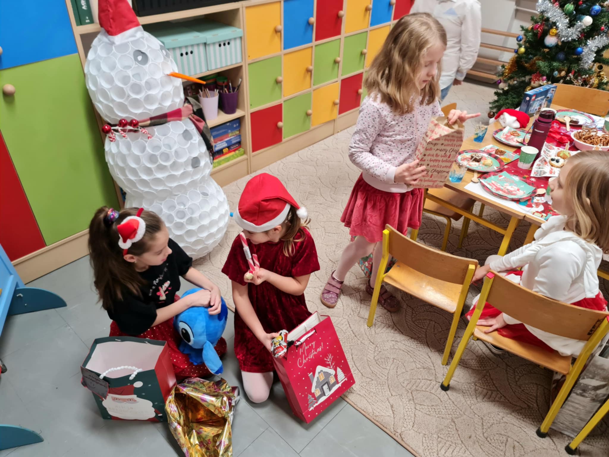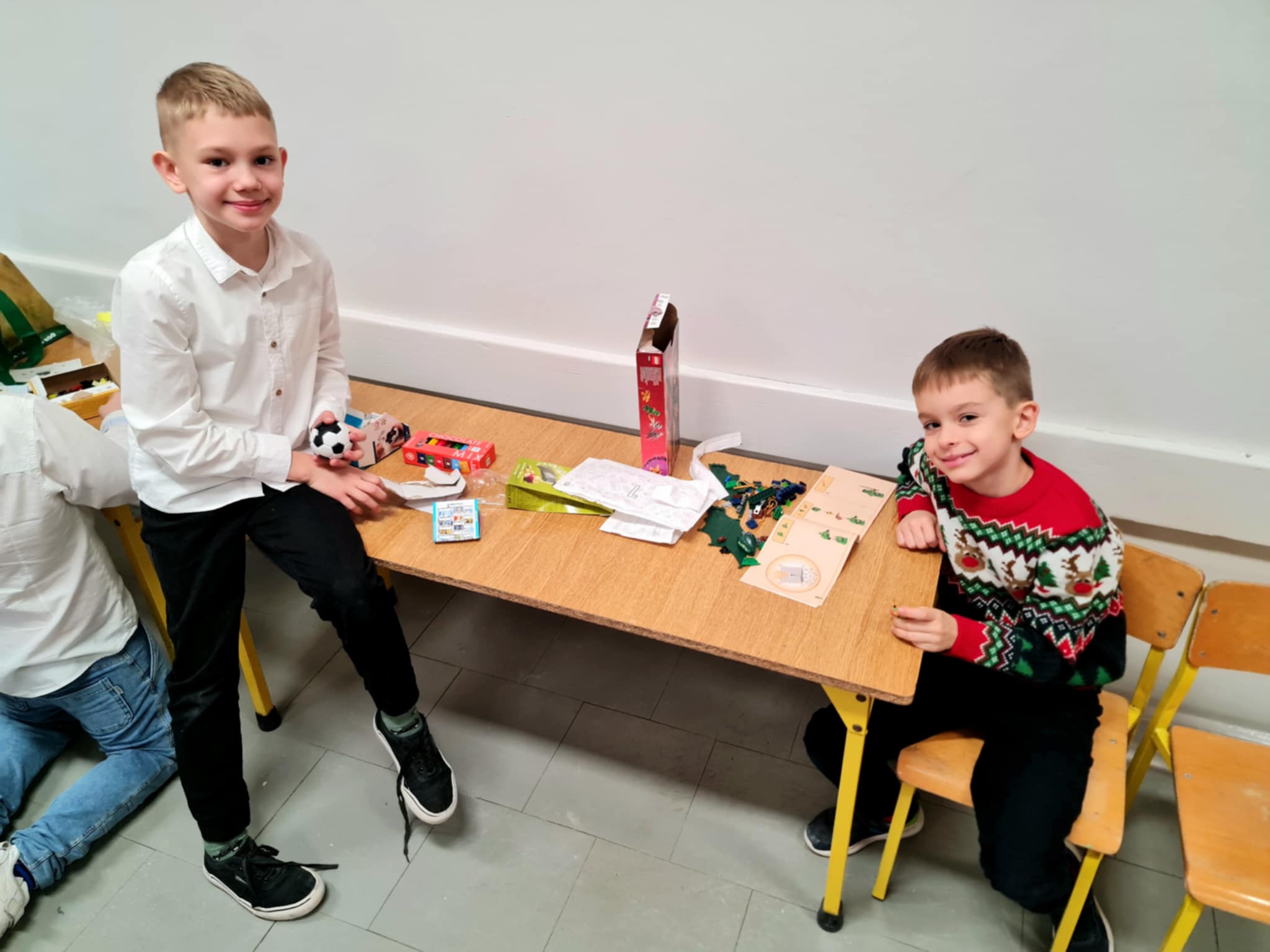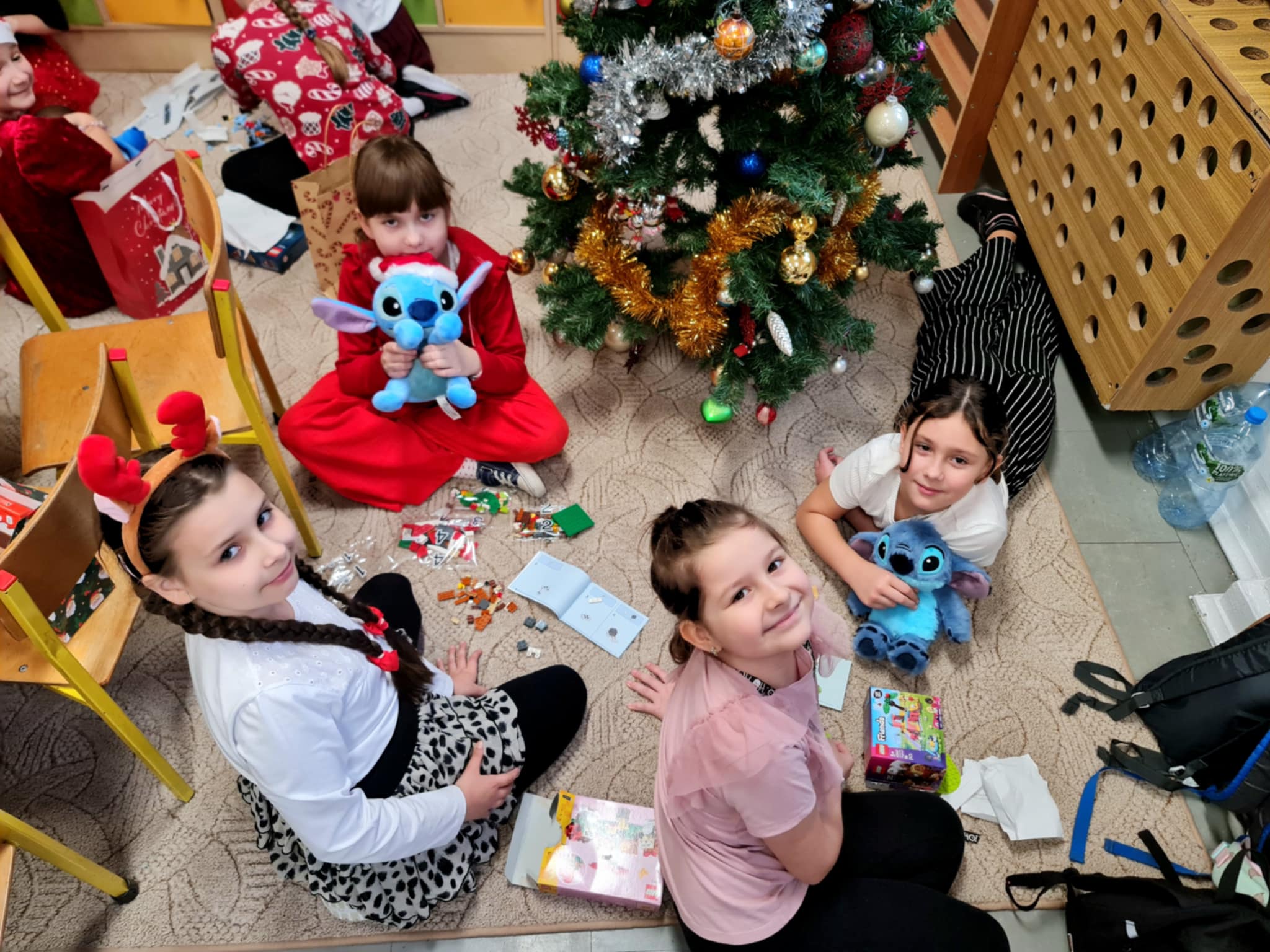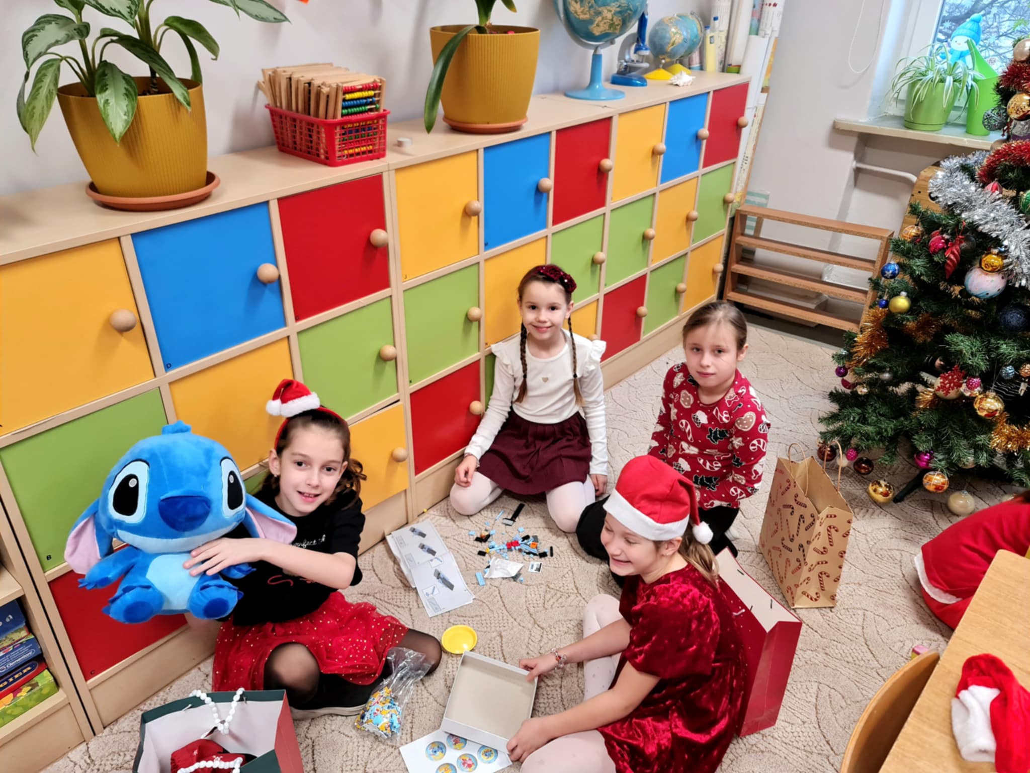 Kolejnym punktem spotkania było rozpakowywanie prezentów, które sprawiły dzieciom ogromną radość. Upominki szybko stały się inspiracją do wspólnej zabawy i wywołały wiele uśmiechów.